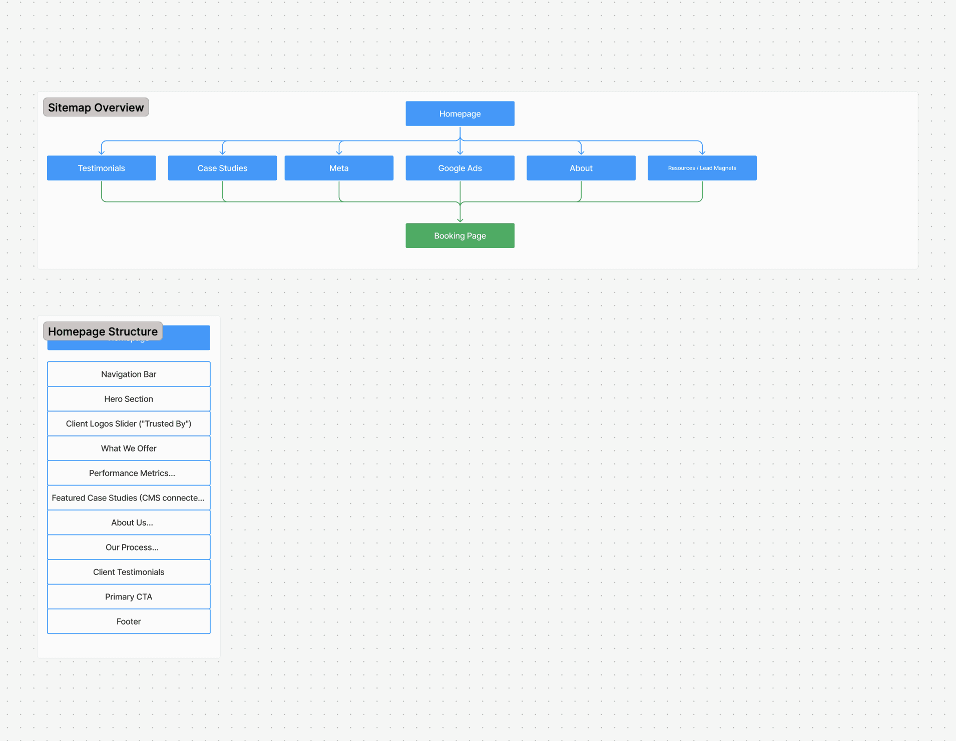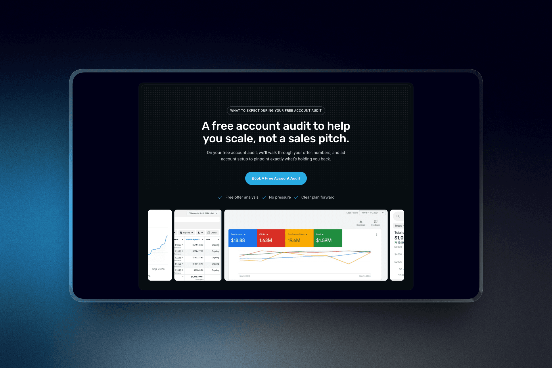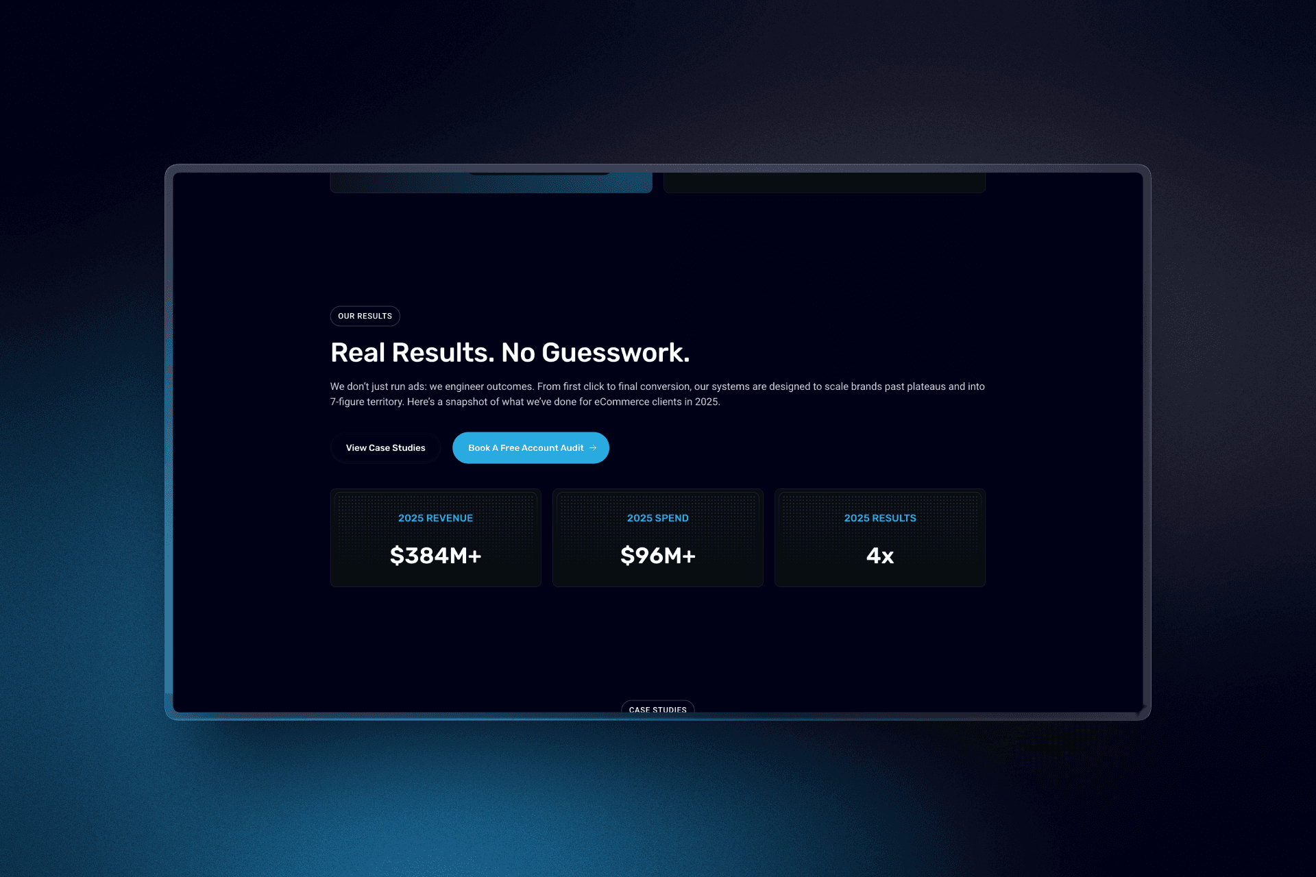 The relaunch included a new homepage, dedicated case studies with individual subpages, and focused landing pages for Google Ads and Meta Ads. We also introduced a clear “Book a call” flow to make it easy for potential clients to take the next step.